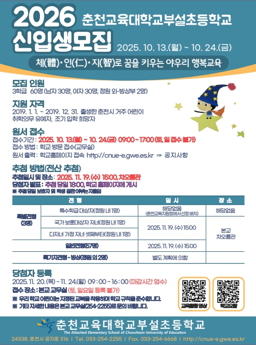 2026학년도 춘천교육대학교부설초등학교 신입생 모집을 안내입니다.