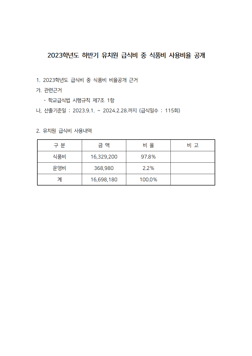 2023학년도 유치원급식비 중 식품비 사용 비율